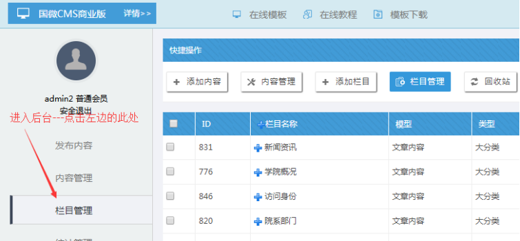 A:先登錄后臺------點擊“欄目管理”------就可以進行欄目管理了;