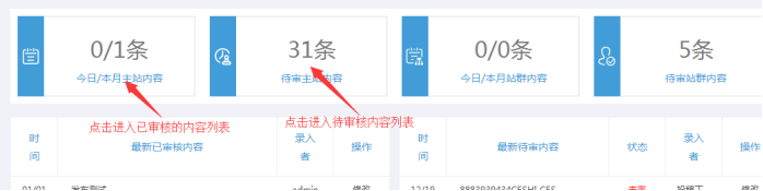 操作提示:此處可以快速修改最新發布內容、最新需審核內容;同時點擊鏈接可以進去列表;可以平常節約很多時間。