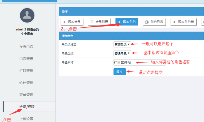 二、添加角色:管理員進(jìn)入后臺(tái)-------會(huì)員/權(quán)限--------添加角色